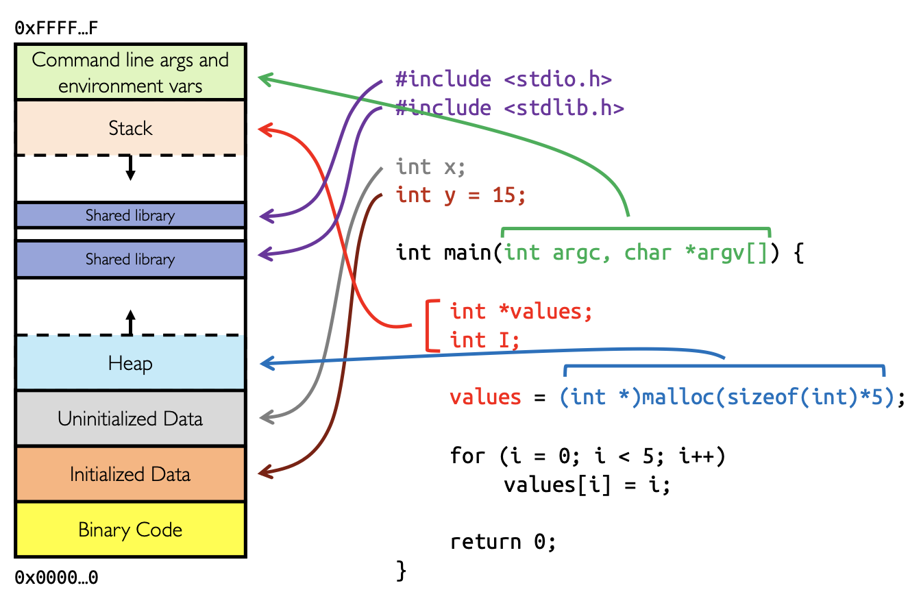 Why do we put shared library between stack and heap? Dynamic Linking: we don’t necessarily need a library. Only link what we need dynamically.