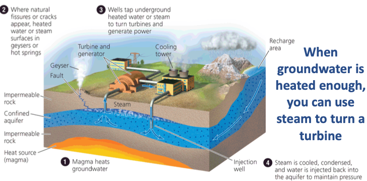 - Warm water vaporized to run a turbine (or its heat used to vaporize another liquid) and vapour is recondensed after chilled by cold water