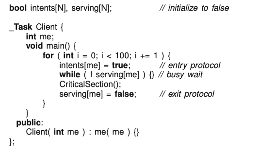 - In the entry protocol, a thread indicates its intent to enter and waits until the arbiter indicates the start of this thread’s turn.