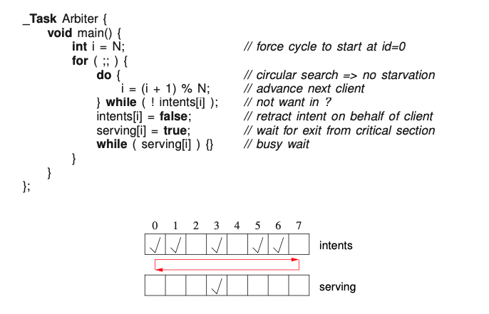 - The arbiter cycles around the N intent-flags looking for a thread wanting to enter. Once one is found, the arbiter indicates the start of that thread’s turn, and waits for the thread to retract its intent indicating it has exited the critical section.