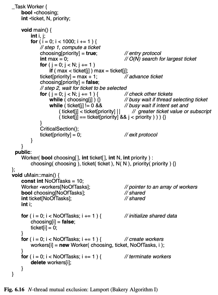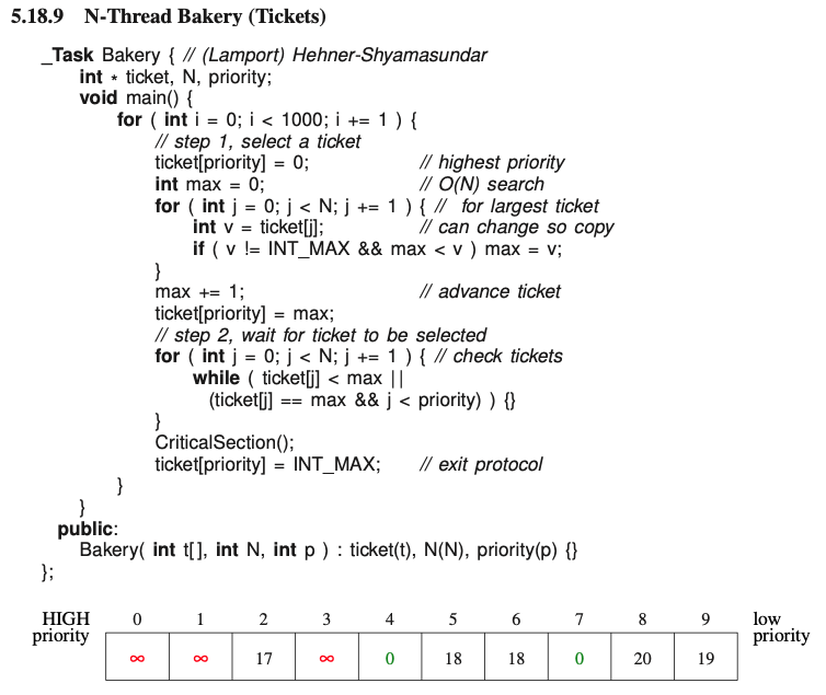 In a bakery, in a bakery, people take a ticket on arrival and then wait for exclusive service. In fact, Lamport’s algorithm is often referred to as the bakery algorithm. If the tickets are serviced in increasing order by ticket number, the people are serviced in FIFO order (in contrast to the cyclic order in the previous algorithm). However, Lamport’s version of tickets is quite different from that used by people in a store. This algorithm uses M intention states (tickets), needing B bits (usually the size of an integer), and N intents.