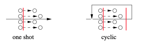 A single barrier provides a one-shot stop and start point, while multiple barriers can be combined into a cycle with multiple stop and start points and repeated interactions.