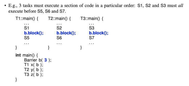 uBarrier:uBarrier(unsigned int total)–this form specifies the total number of tasks participating in the synchronization. Appropriate values are 0. A 0 initialization value implies the barrier does not cause any task to wait, but each calling task runs member routine last.