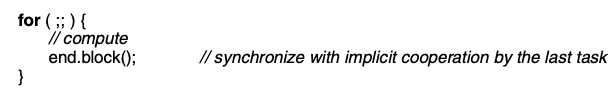 It is possible to eliminate both the coordinator task and the start synchronization simply by using cooperation among the worker tasks. The cooperation has the last worker synchronizing at the barrier, i.e., the task that ends the computation phase does the necessary summary work plus the initialization to begin the next computation, and finally, releases the other worker tasks. This action is done implicitly by the barrier, which knows when the last task arrives and uses that task’s thread to execute some cooperation code on behalf of all the tasks. Therefore, the last task does the work, but the code to do it is part of the barrier not the task’s main.