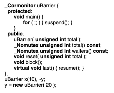 In C++, the type uBarrier defines a barrier and a barrier is a special kind of coroutine called _Cormonitor: