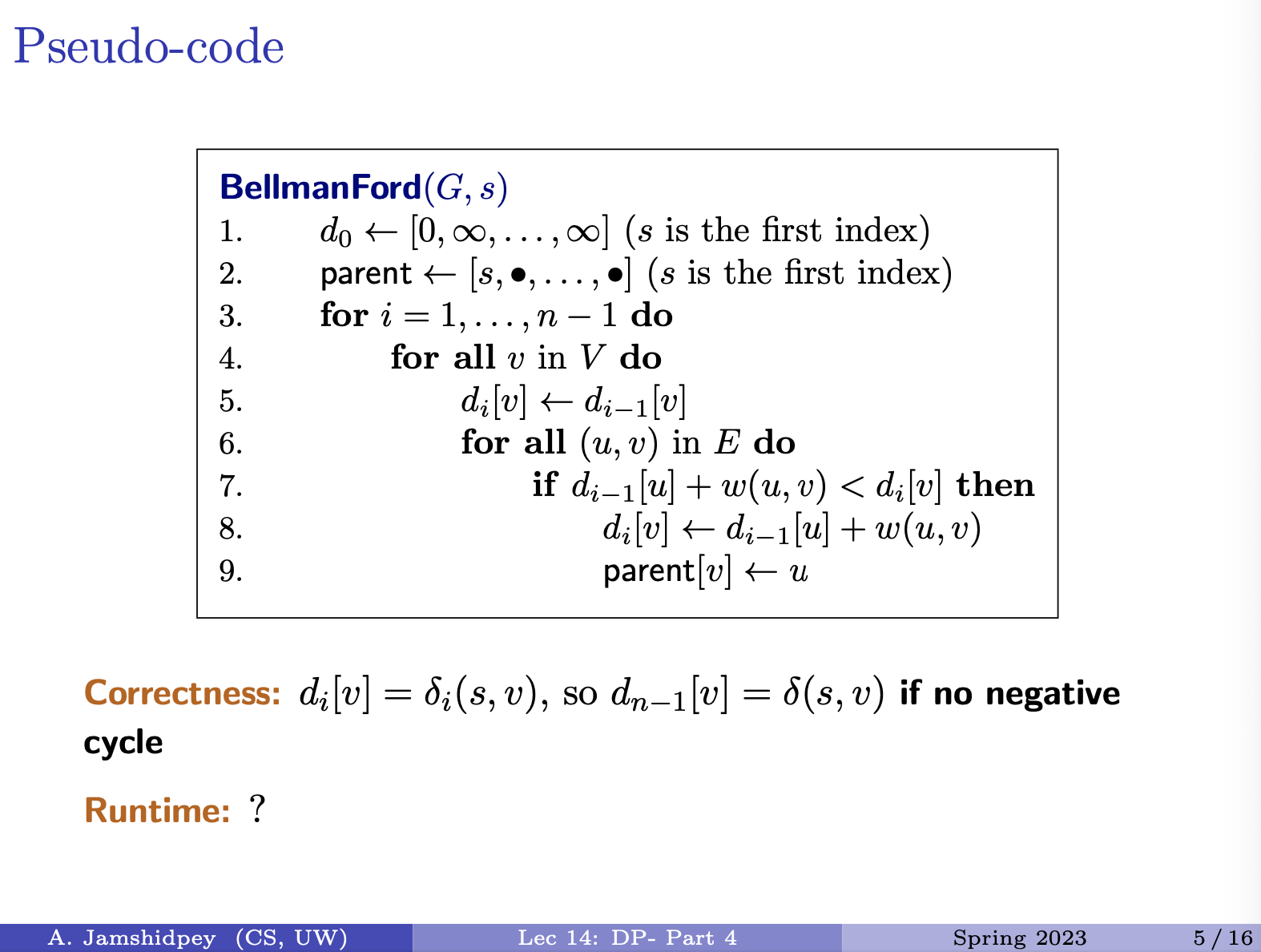 - For every , at the end of the -th iteration, from any vertex , following the predecessor trail recorded in predecessor yields a path that has a total weight that is at most , and further, is a lower bound to the length of any path from source to that uses at most edges.