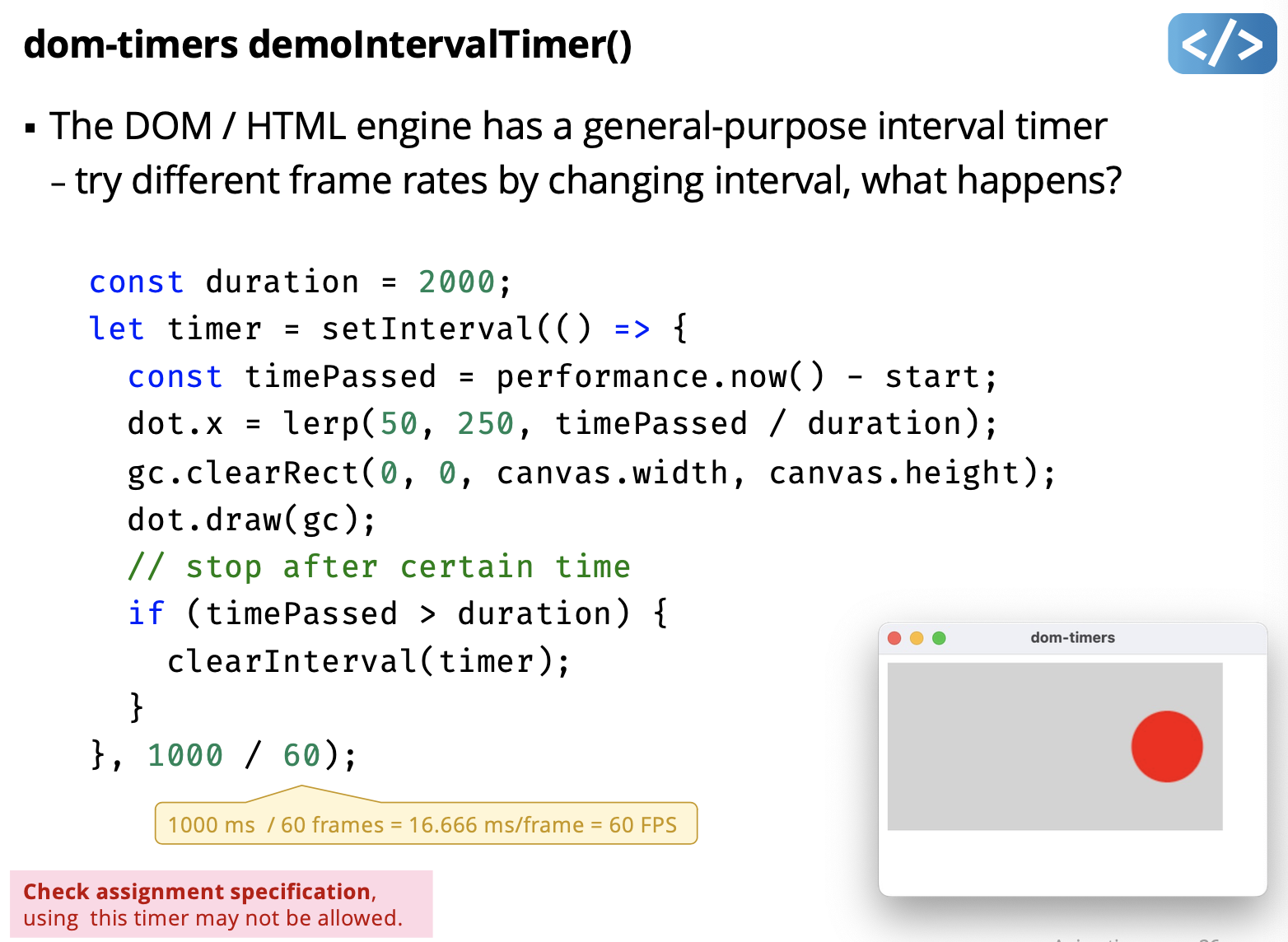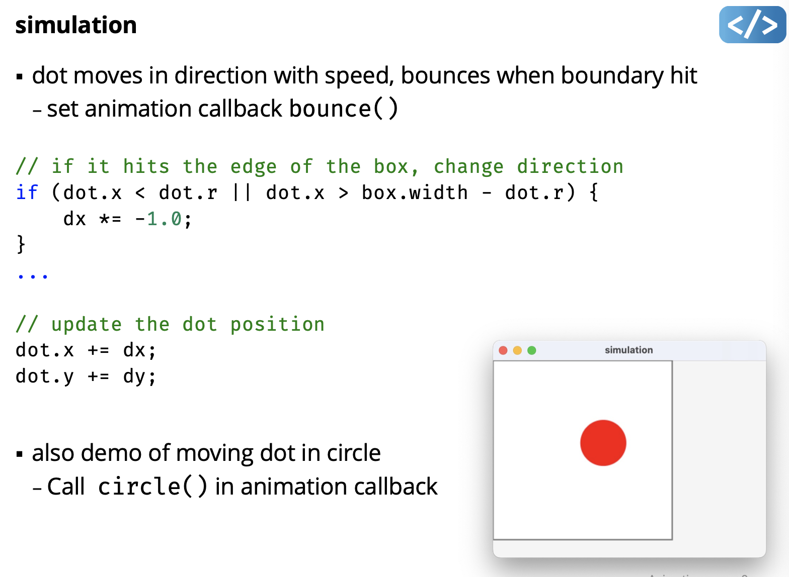 He has a dot, and draws a square. check if the dot’s position is within the square, otherwise, change the direction. It has two animations bounce() and circle(time).