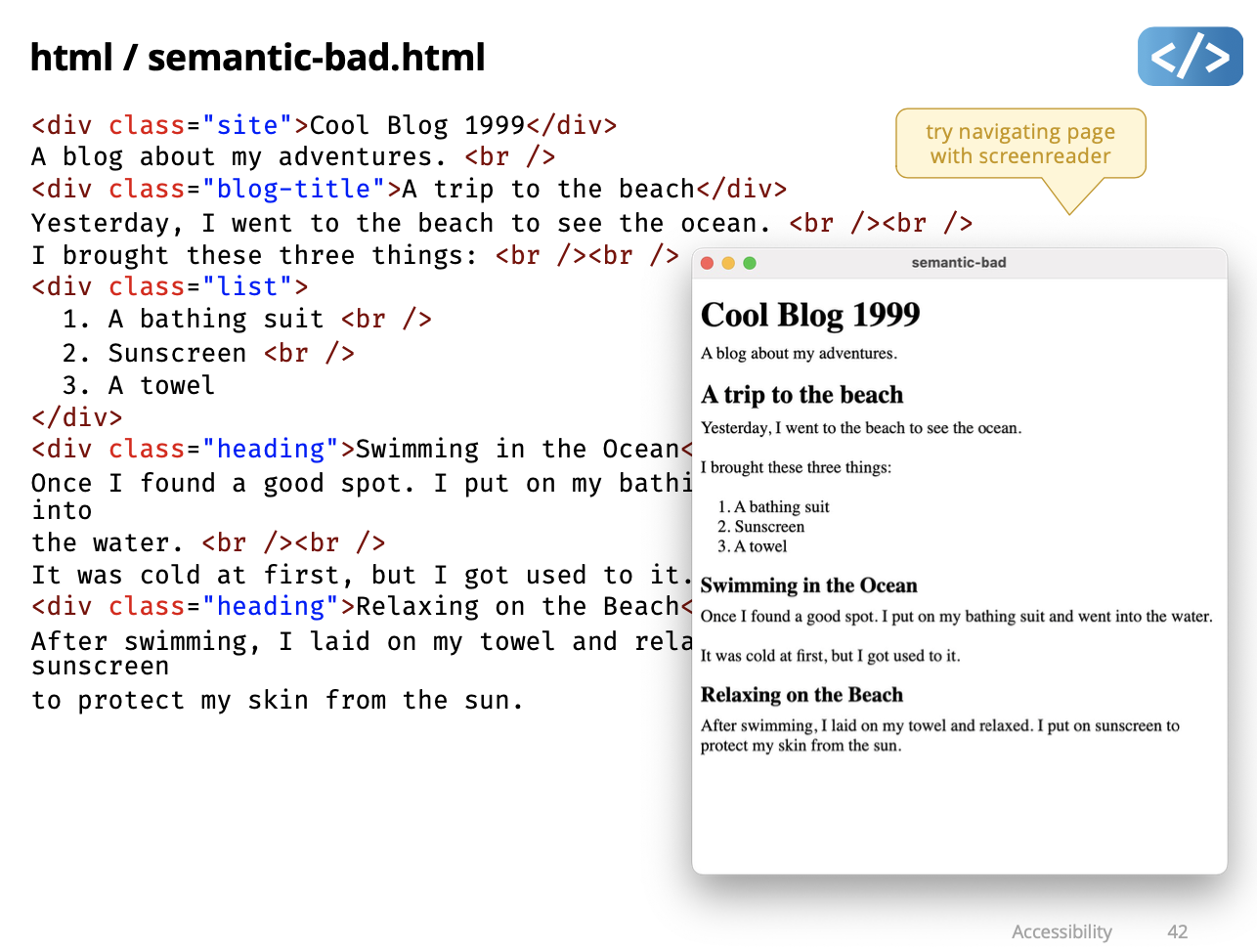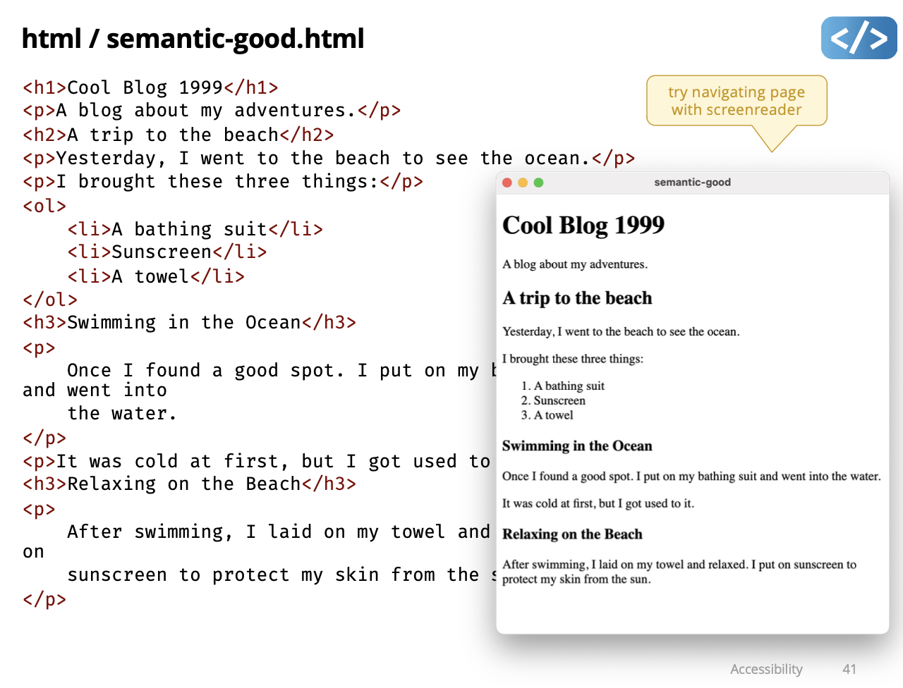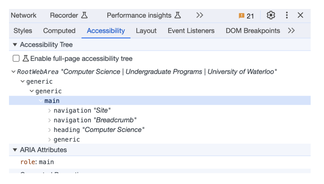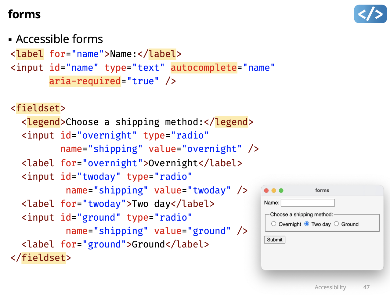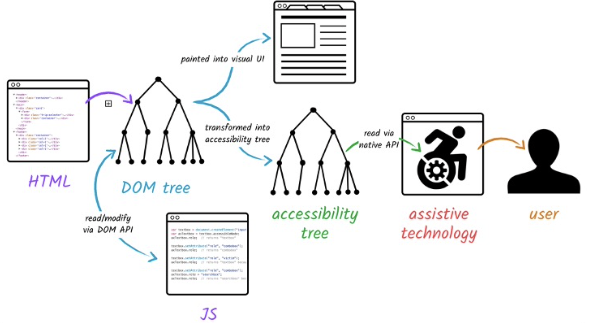 - examples of ARIA roles without HTML equivalent: toolbar, tooltip, feed, math, presentation, note