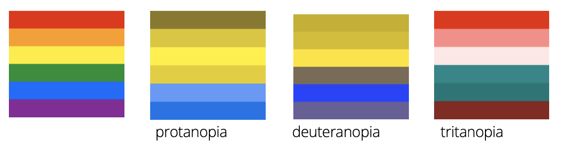- Tritanopia: missing blue cones, (and blue sensitive rods) (rare)