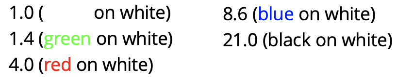 Ratio of perceived luminance for two colours (e.g. foreground text and background), examples: