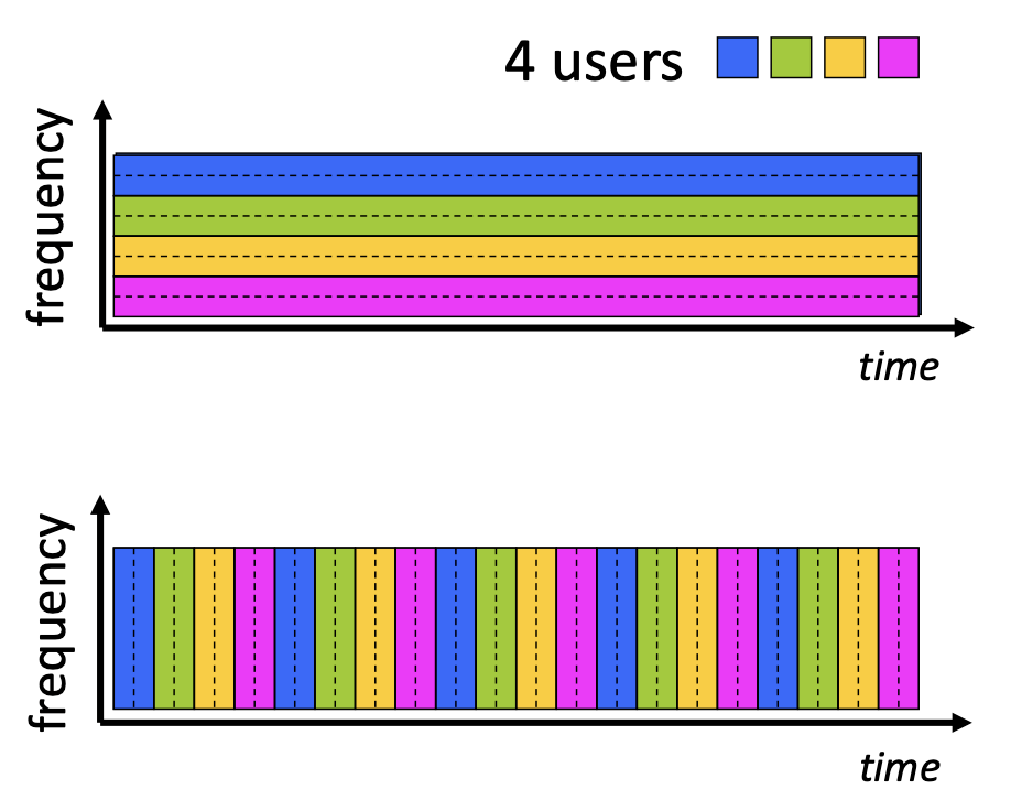 - The diagram shows four users sharing the same frequency band, but each transmitting data only during their allotted time slots in periodic frames.