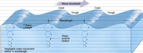 - Water particle motion is in circular orbits - largest orbits at the surface and they get smaller with depth