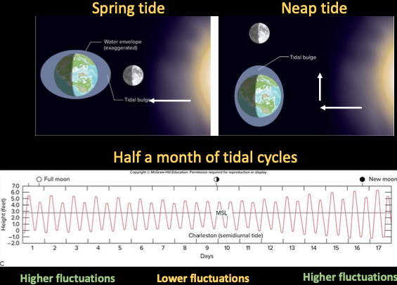 - Spring tides – occur when sun, moon, and earth are aligned (full and new moons) and have highest tidal fluctuations