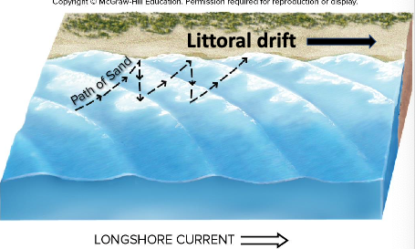 - Sediments moves onto beach at an angle with waves but also pushed down the beach with the longshore current