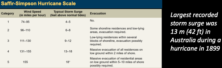 Storm surge - unusual increase in local sea level due to a storm, primarily the winds pushing water onshore and low pressure allowing a bulge in water level
