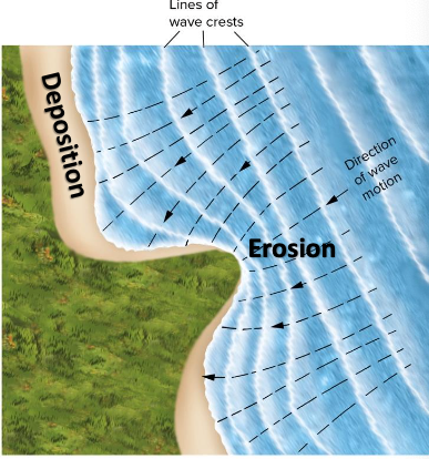 - deflection of waves around irregularities in coastline concentrates wave action on a headland