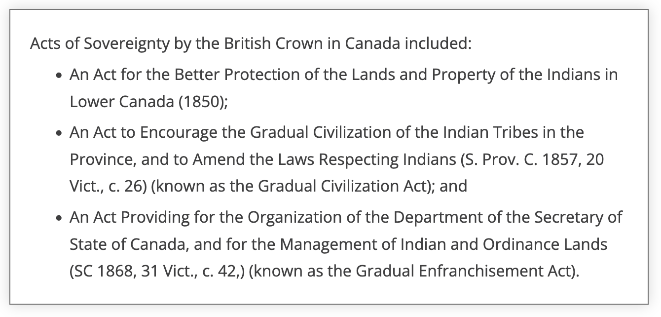In order to secure sovereignty over what is now Canada, the British Crown created the constitutional British North America Act of 1867. Further acts of sovereignty, which began with the Royal Proclamation of 1763 (which will be detailed on the next content page) included acts that created a legal status of “Indian”. The creation of a legal status of “Indian” subjugated Indigenous people under British law. Through these British “acts of sovereignty” Indigenous people lost their own soveriegnty, and were treated as subjects requiring assimilation. Attempts to assimilate Indigenous people into British, now Canadian, law involved the attempted annihilation of Indigenous identities, cultures, and traditions.
