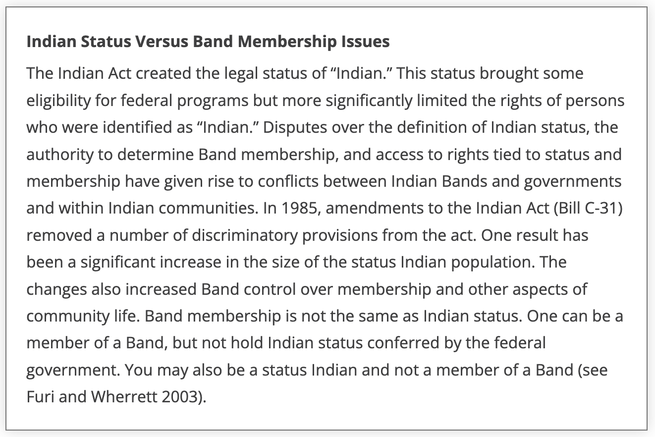 A series of cases trace the debates concerning land rights and treaty rights. These are distinct legal matters, different from legal questions of Indian status concerning the Indian Act. Both legal questions of “Indian status” and “Aboriginal rights” remain contested in provincial and federal courts. Political debates are also ongoing amongst Indigenous people and settler Canadians. You are encouraged to explore the further listening, further reading, and further watching resources provided in this week’s content to familiarize yourself with these debates.