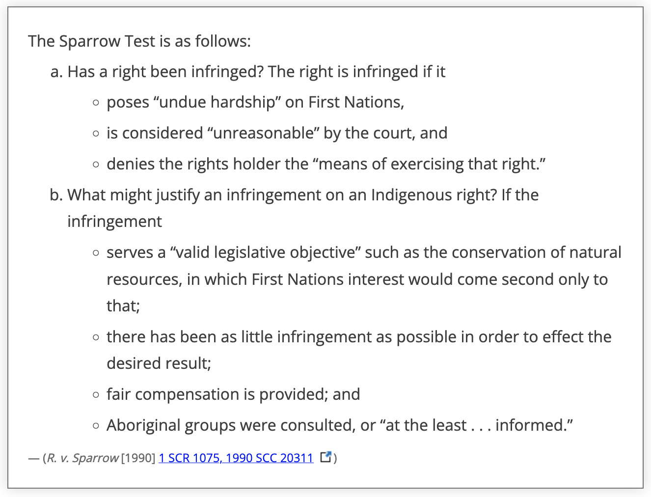 However, in spite of the gains made in the Delgamuukw decision, the development of agriculture, forestry, mining, hydroelectric power, building infrastructure could ALL justify infringement of those rights, as per the Sparrow Test. Remember, the Sparrow Test laid out the criteria for justifying a breach of Aboriginal title. Delgamuukw did not overturn this test.
