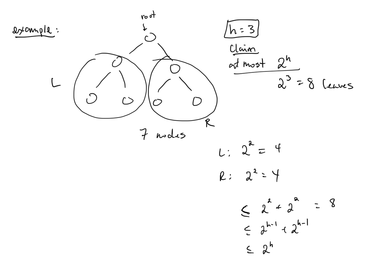 Claim: In a binary tree, for , there are at most leaves of level (depth) at most . Proof: if , there is indeed at most leaf of level at most . Otherwise, for , we suppose this is true for , and prove it for . If the tree is just a root, there is leaf of level at most , so we’re good. Else, all the leaves in our tree are either leaves in the left (), or the right subtree () at the root. The leaves of level at most in have level at most in either or , so by the induction assumption there are at most in . This gives a total .