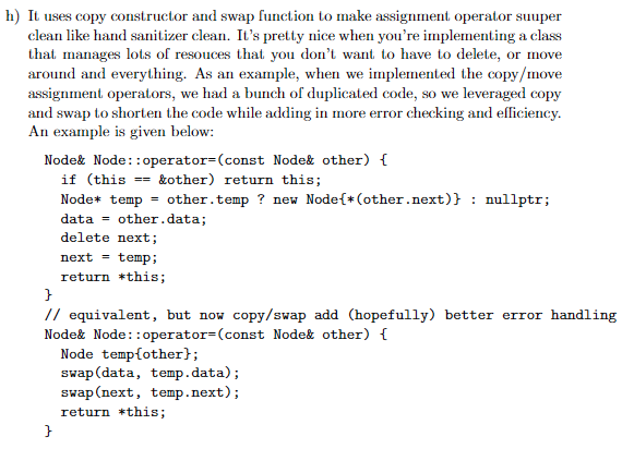 Conceptually, it works by using the copy-constructor’s functionality to create a local copy of the data, then takes the copied data with a swap function, swapping the old data with the new data. The temporary copy then destructs, taking the old data with it. We are left with a copy of the new data.