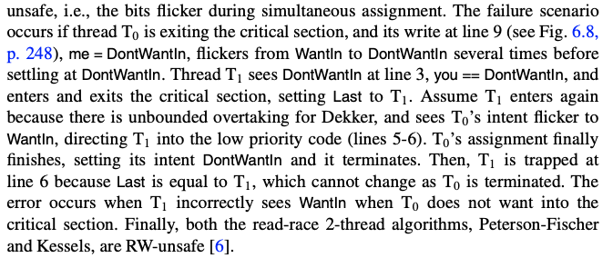 you == WantIn && Last == &me, where the new condition enables progress should the other thread not return. - On exit, Last is not changed if a thread makes repeated entries, the assignment causes Last to flicker.