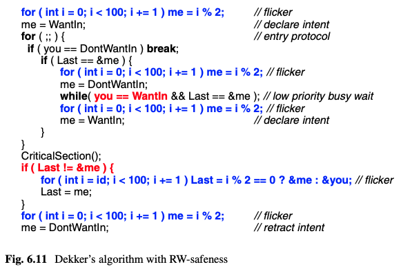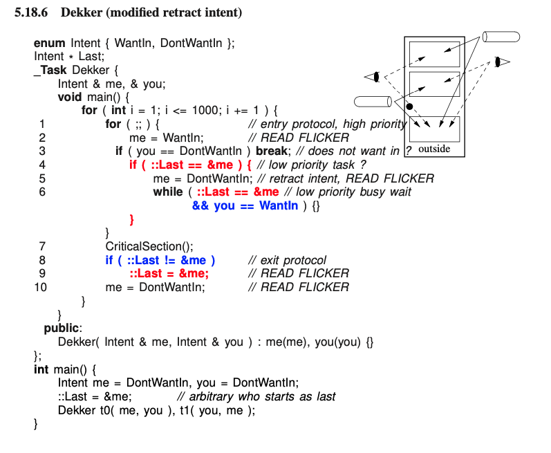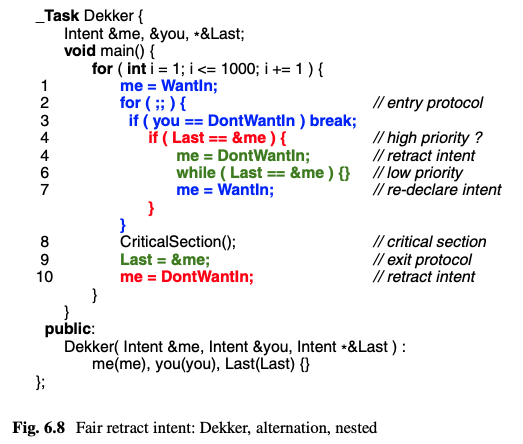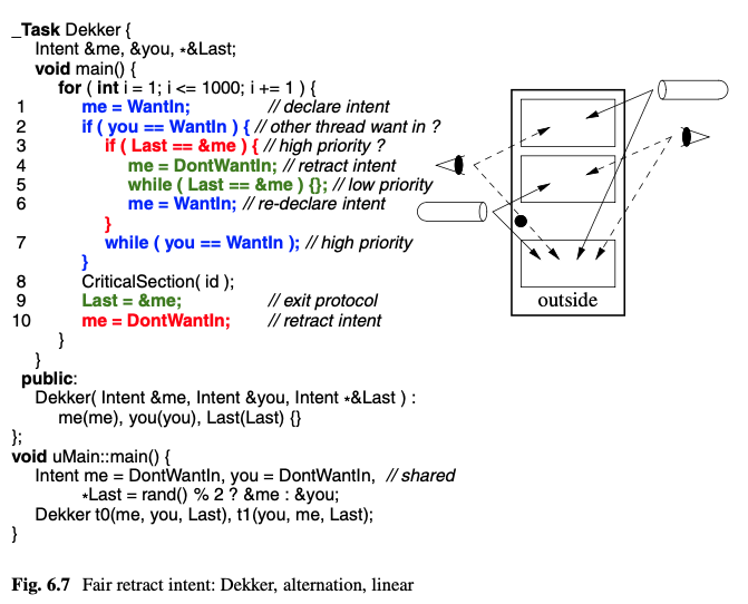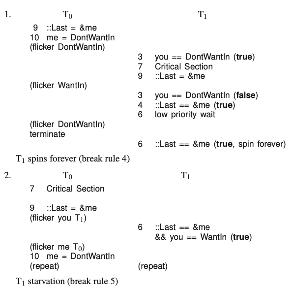 The outer loop (line 2) is where the high-priority thread busy waits, and the inner loop (line 6) is where the low-priority thread busy waits. The if statement (line 4) controls which thread has low or high priority. The low-priority loop is nested in the high-priority loop because of the two steps in the exit protocol: setting Last and retracting intent. The low priority thread in the nested loop of the entry protocol might detect Last having changed, exit the busy loop, but still have to wait for the other thread to complete the exit protocol by retracting its intent. Think of what could go wrong if the low priority thread did not wait for the other thread to complete all the exit protocol before preceding into the critical section. In the case of simultaneous arrival, the thread last in the critical section is directed to the low-priority code, where it retracts intent (line 5), so the other thread can make progress. Hence, livelock is prevented by alternating on simultaneous arrival, and rule 4 is satisfied.