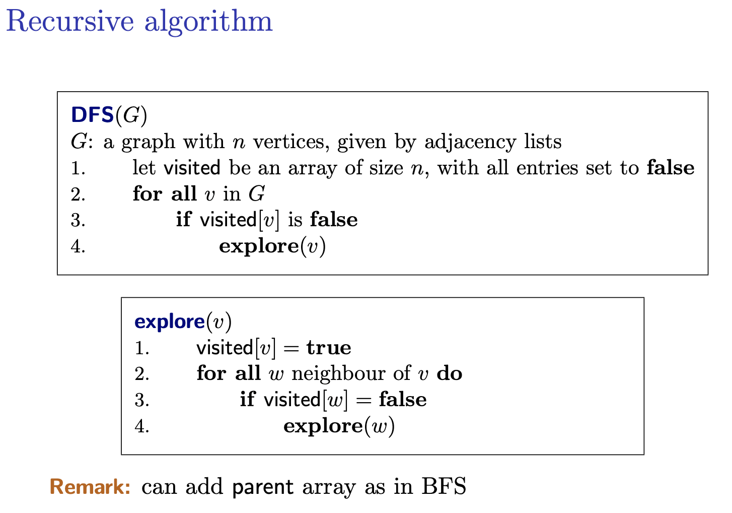 visitedis outside the for loopThis is my intuition. You mark the node as visited while you are inside the DFS function. And then process it. This is NOT the case with BFS , which you mark it inside the for loop. Then, process it a bit later. That is because they use a Queue data structure.