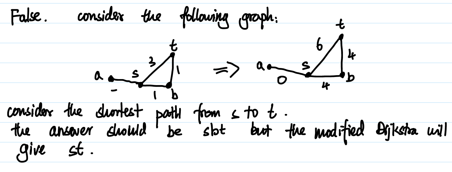 - True or False. Given a directed graph with possibly negative edge weights (but no negative cycle) and a source vertex , we can apply the following reduction to use Dijkstra’s Algorithm to find single source shortest paths from to every other vertex: let be the minimum edge weight, we modify each edge weight to and then apply Dijkstra’s algorithm to the modified graph with source .
