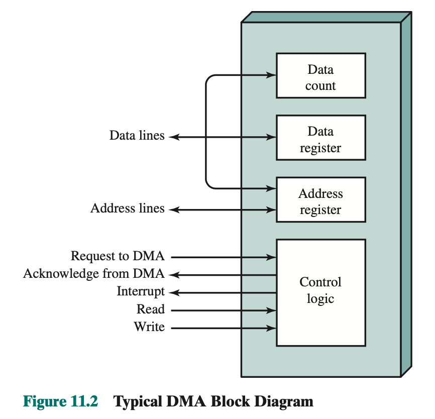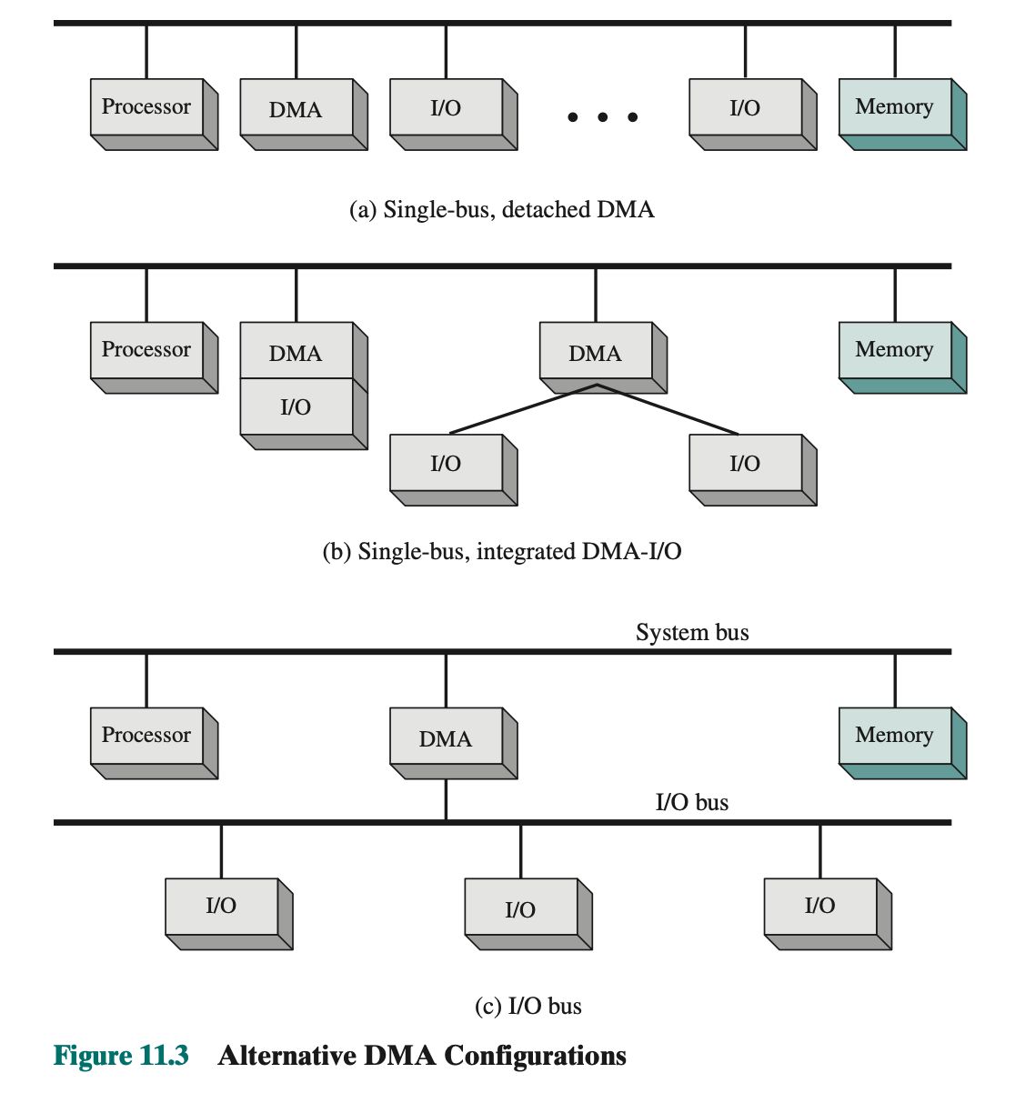 - DMA module, acting as a surrogate processor, uses programmed I/O to exchange data between memory and an I/O module through the DMA module.