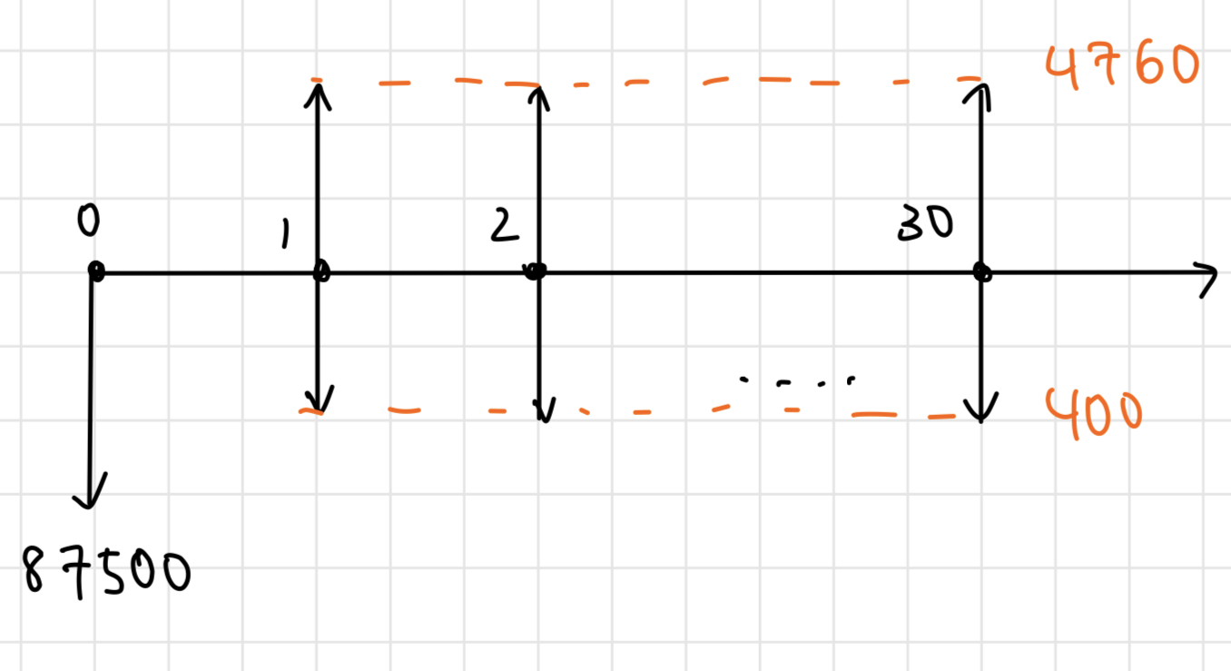 0 = -87500 - (400 - 5000)(, ^*, 30) + 4760(,i^*, 30) = -87500 + 9360