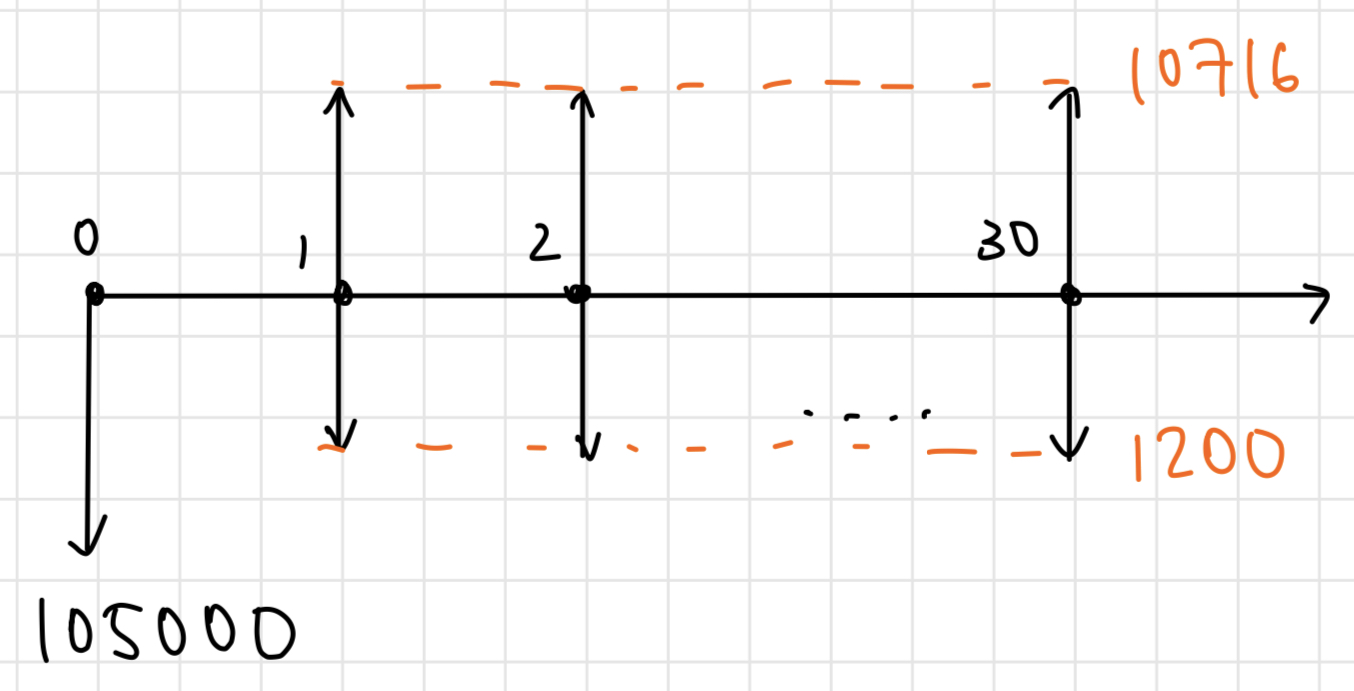0 = -105000 + (1200 - 5000)(, i^*, 30) + 10716(, i^*, 30) 0 = -105000 + 14516 = .135 .135 > .12