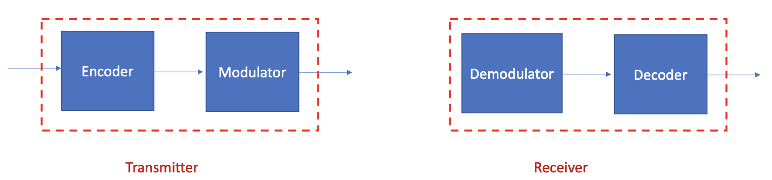 - Encoder: to compress and add redundancy to optimize detection at the receiver.