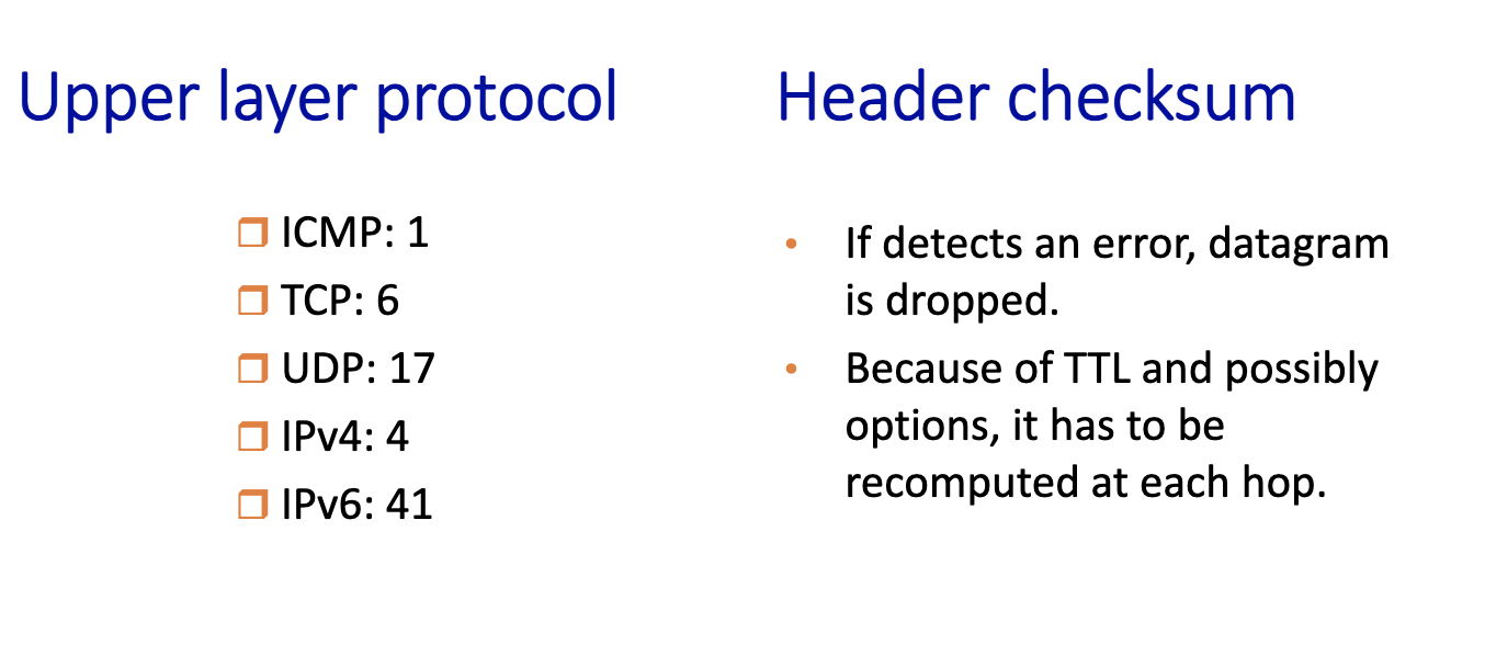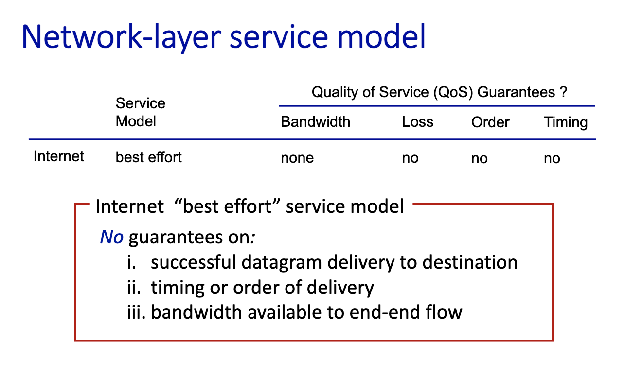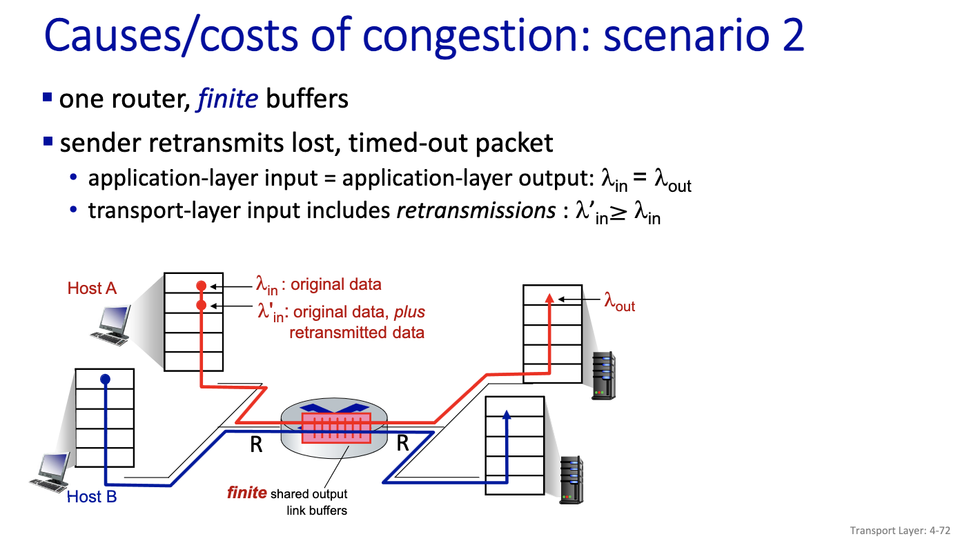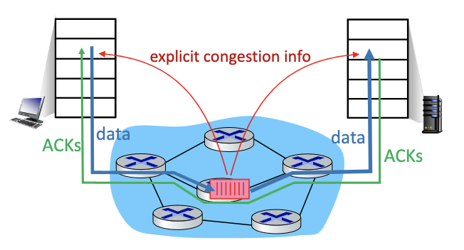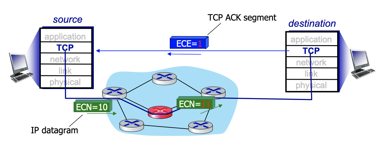 - Mark IP header →IP datagram with 2 bits when there is a problem (router don’t know anything about the TCP). But still putting 2 bits, mark all packets 11 if there is a problem. Which is going to TCP layer of destination. And destination is put the bit on ACK segment (layer 4 TCP) to say there’s explicit congestion