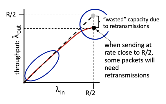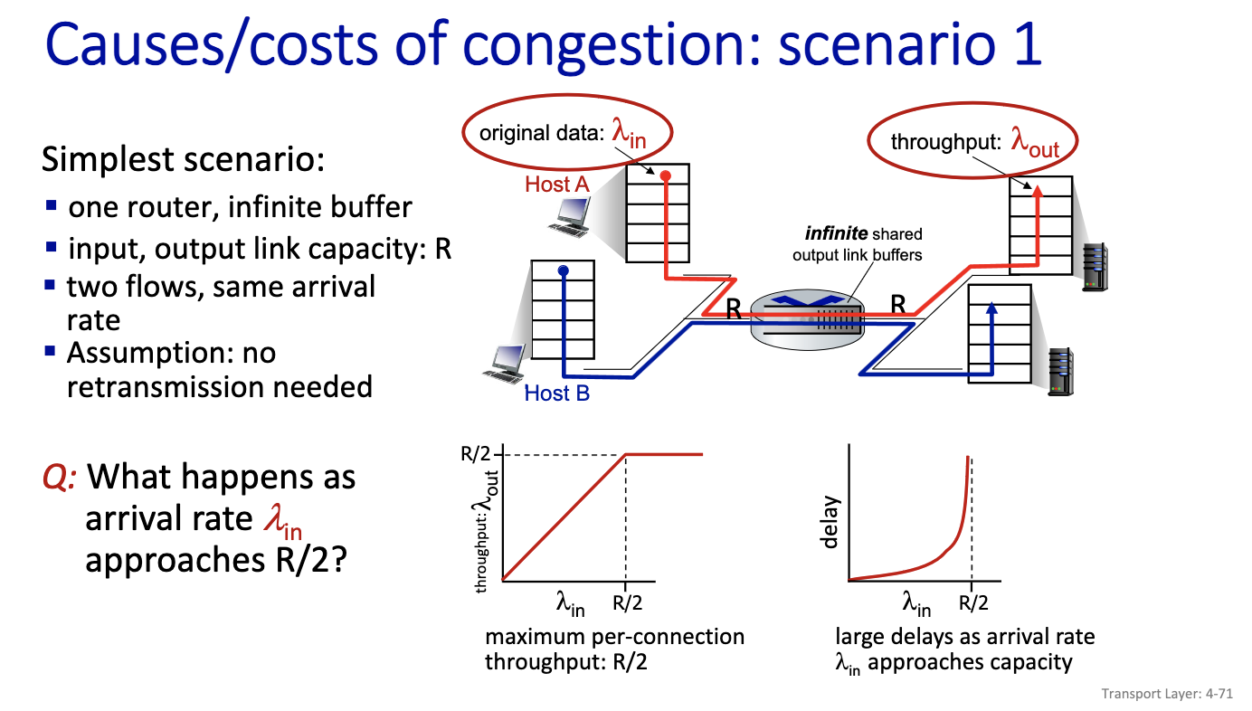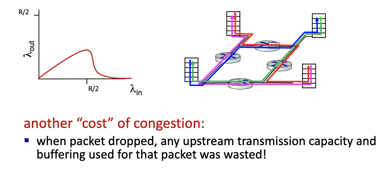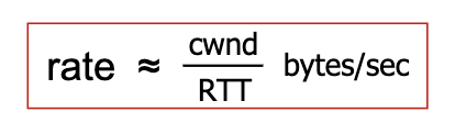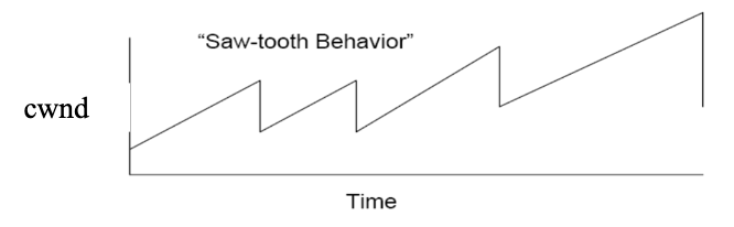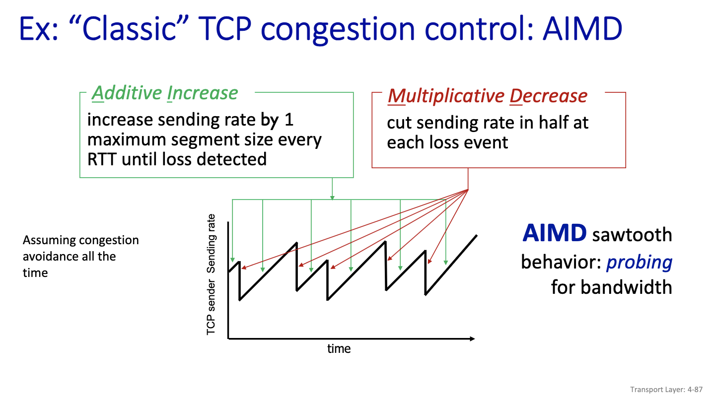 - Approach: sender increases transmission rate (specifically, its window size, i.e., cwnd), probing for usable bandwidth, until problem (loss event) occurs. When problem is detected, it decreases cwnd.