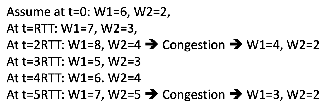 Example: two competing TCP sessions with same RTT on bottleneck link of rate 10 segments per RTT.