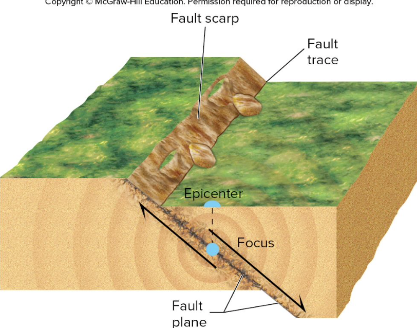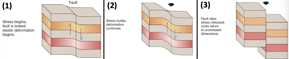 - Rocks snap back elastically to their previous dimensions after the sudden displacement and associated stress release ⇒ elastic rebound