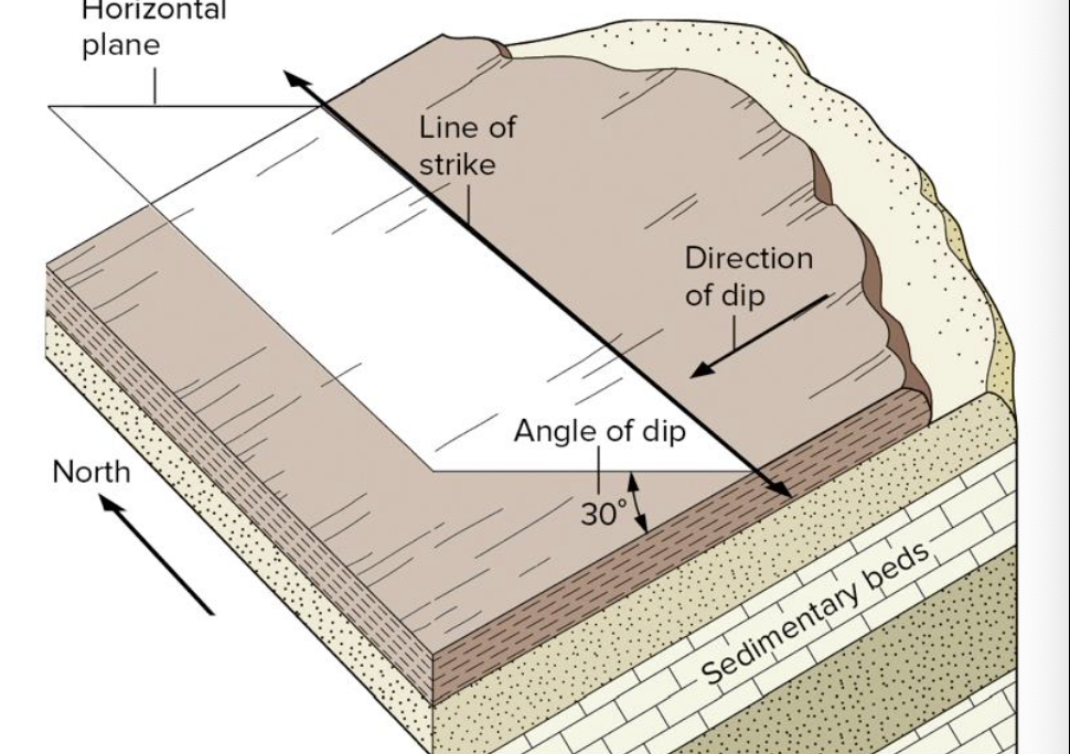 - Strike - compass direction the bed is sitting (perpendicular to dip)