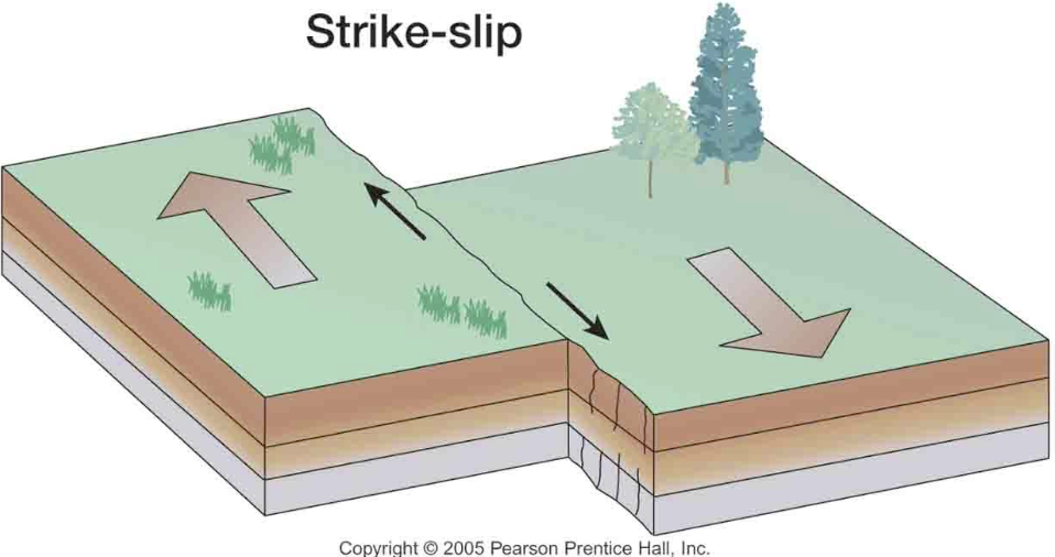 Strikes-slip fault - displacement occurs parallel to strike of rock (horizontal movement and displacement)
