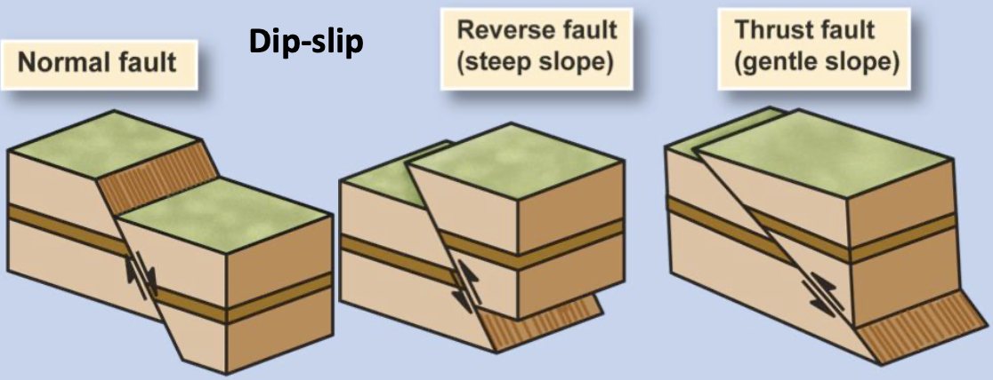 Dip-slip fault - displacement occurs in the vertical direction wit the dip