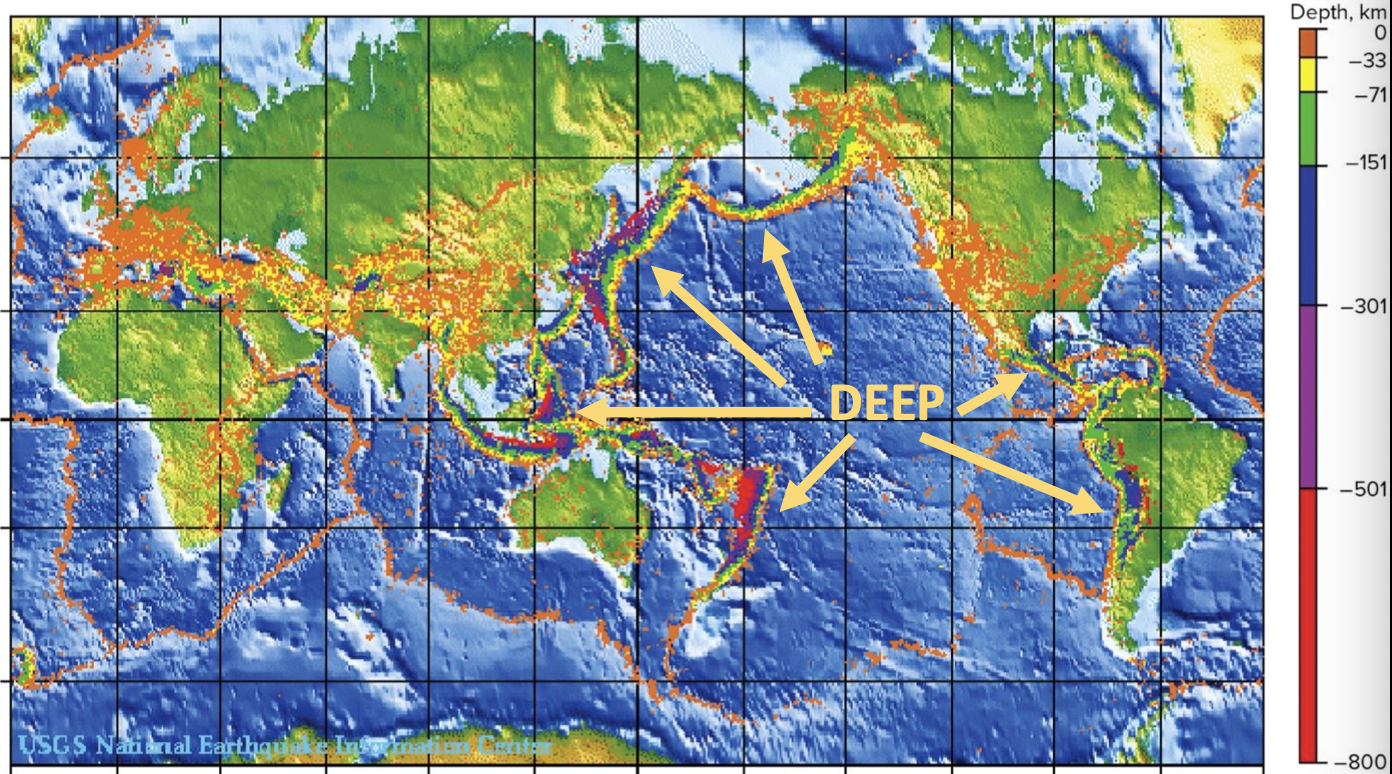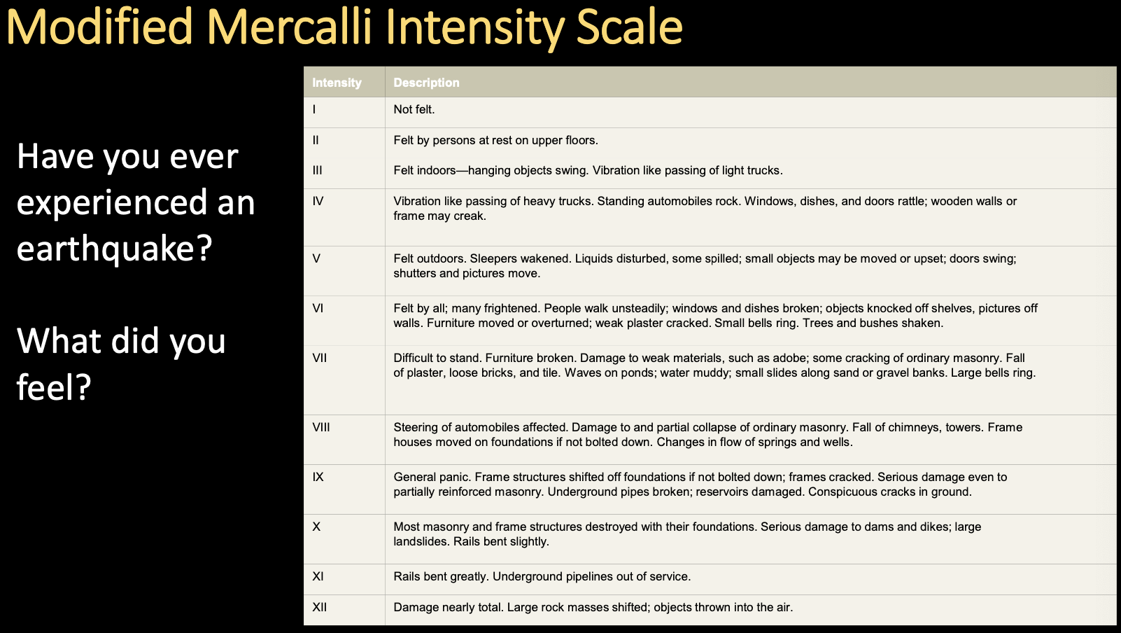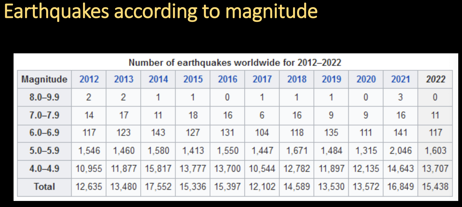 - Richter magnitude scale: Based on shaking / displacement near epicenter, but developed in California and not useful in other regions with deeper earthquakes on different types of faults and rocks.