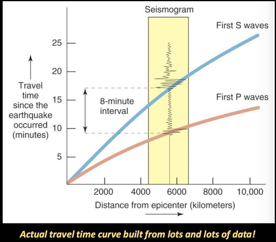 - Interval of time between the first arrivals of P waves and S waves is a function of distance to the epicenter