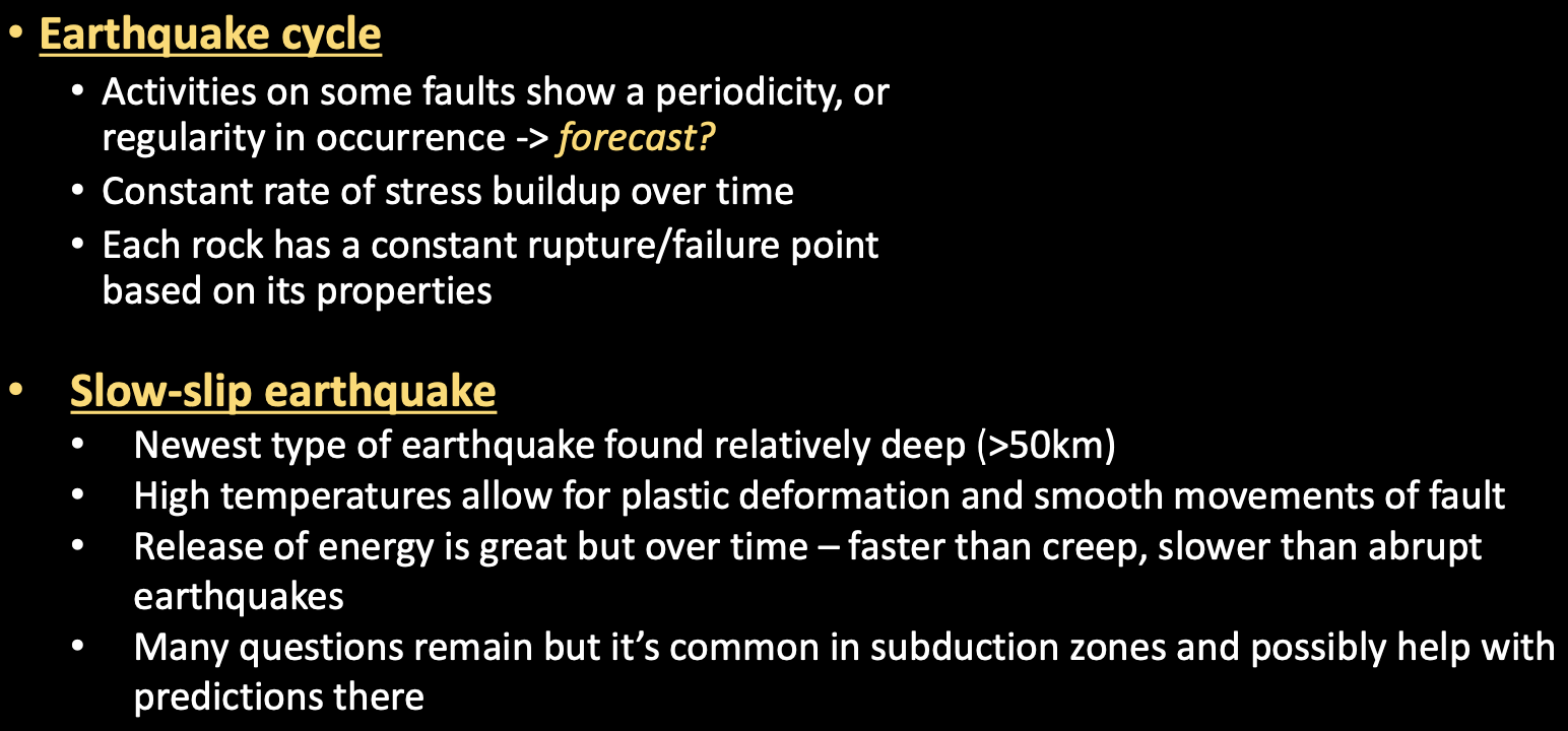 - If the stress exceeds the friction (or rupture strength of the rock), a sudden movement occurs to release the stress ⇒ earthquake or seismic slip