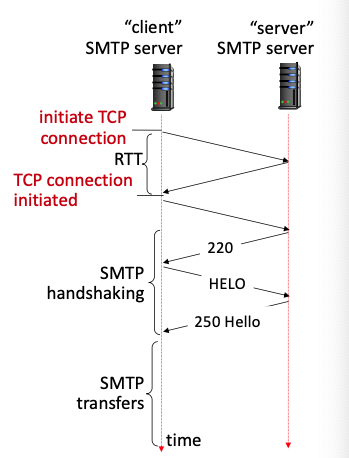 - uses TCP to reliably transfer email message from client (mail server initiating connection) to server, port 25
