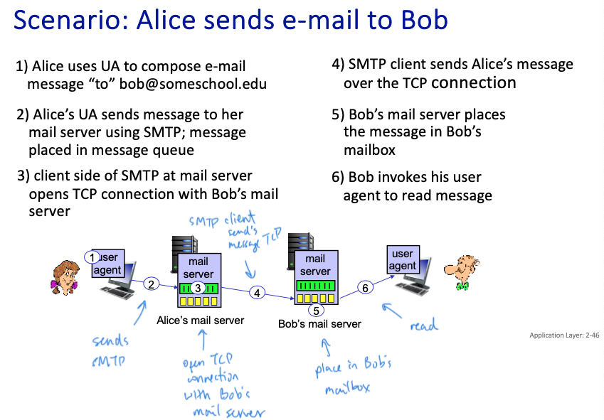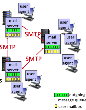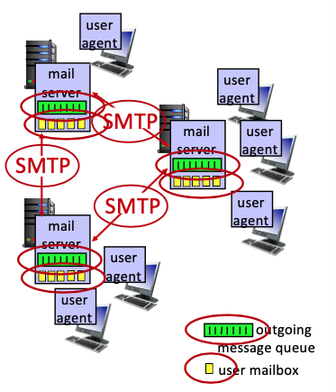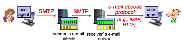 - HTTP: gmail, Hotmail, Yahoo! Mail, etc. provides web-based interface on top of SMTP (to send), IMAP (or POP) to retrieve e-mail messages