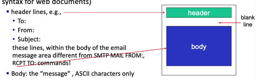 - SMTP: delivery/storage of e-mail messages to receiver’s server used 2x