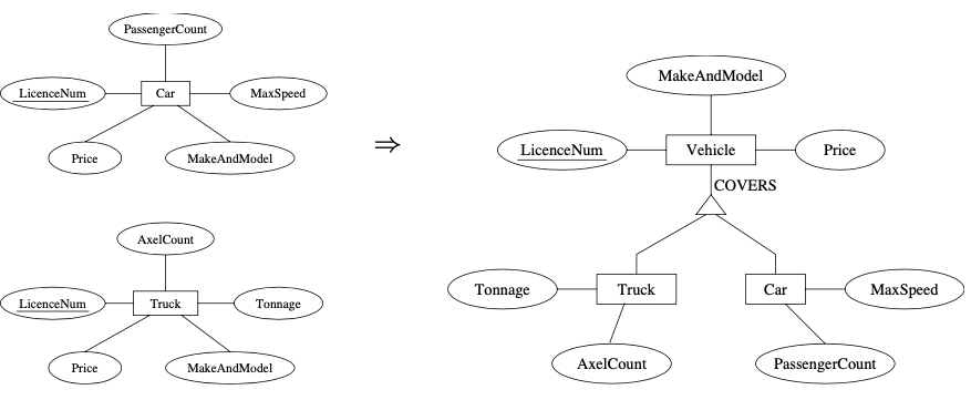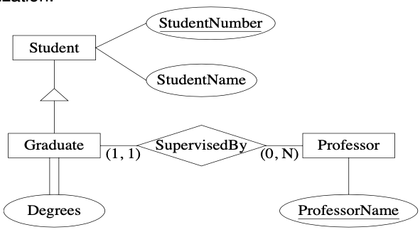 - Generalization: Covers, entities that have a leas one of two or more other entity sets subsets.