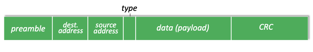 Ethernet Ethernet uses Collision Detection (CD). No ACK in ethernet Ethernet frame structure: preamble addresses type CRC data payload
