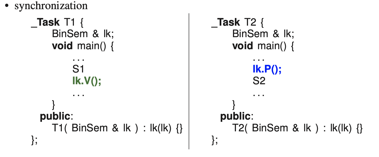 - Thread executing S1: after completing the CS or action S1, this thread performs a V operation on the semaphore. The V increments the semaphore’s value from 0 to 1, signalling that S1 has been completed.