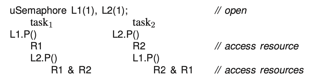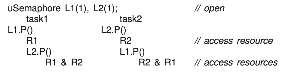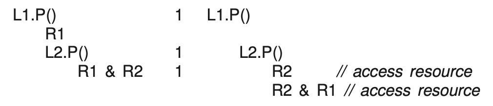 R2 & R1So Task_1 acquires L1 first by calling L1.P(), then acquires L2 by calling L2.P(). It access R1 and R2 in this order. Task_2 also acquires L1 first by calling L1.P(), then L2.P(). Accesses R2 and R1 in this order.
